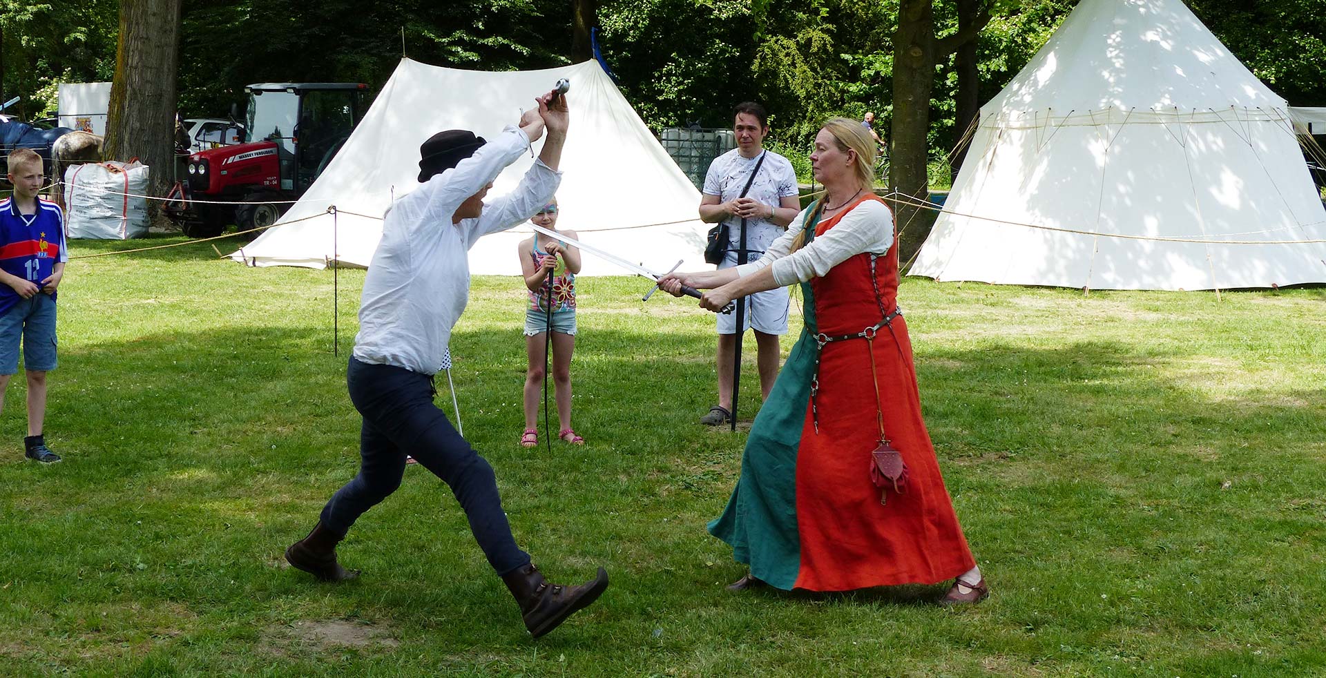 Wij hebben meer dan 20 jaar ervaring met middeleeuws zwaardvechten, zowel als lid van een zwaardvechtschool, als tijdens vele nagespeelde middeleeuwse veldslagen in binnen- en buitenland. Wij kunnen middeleeuwse zwaardvechtdemonstraties geven, waarbij o.a. uitleg gegeven wordt over de diverse uitgangshoudingen en slagen, maar waar uiteraard ook een heus gevecht plaats vindt! Wij doen dit op scholen, kastelen, evenementen, feesten, enz. De middeleeuwse zwaardvecht demonstratie is goed te combineren met een van onze andere activiteiten, zoals b.v. met onze muziek.